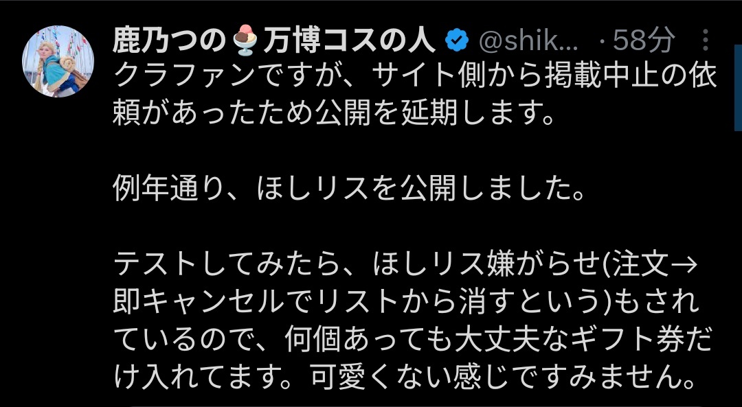 素直に「開示請求費用のため」と言って規約に引っかかったか 🦌さん自身が思うアイデンティティはきっとコスプレで、すぐご用意出来るリターンはコス写真集かと思われるので 版権コスで著作権に引っかかったとかですかね… x.com/kgbx9rqrznc5gu…