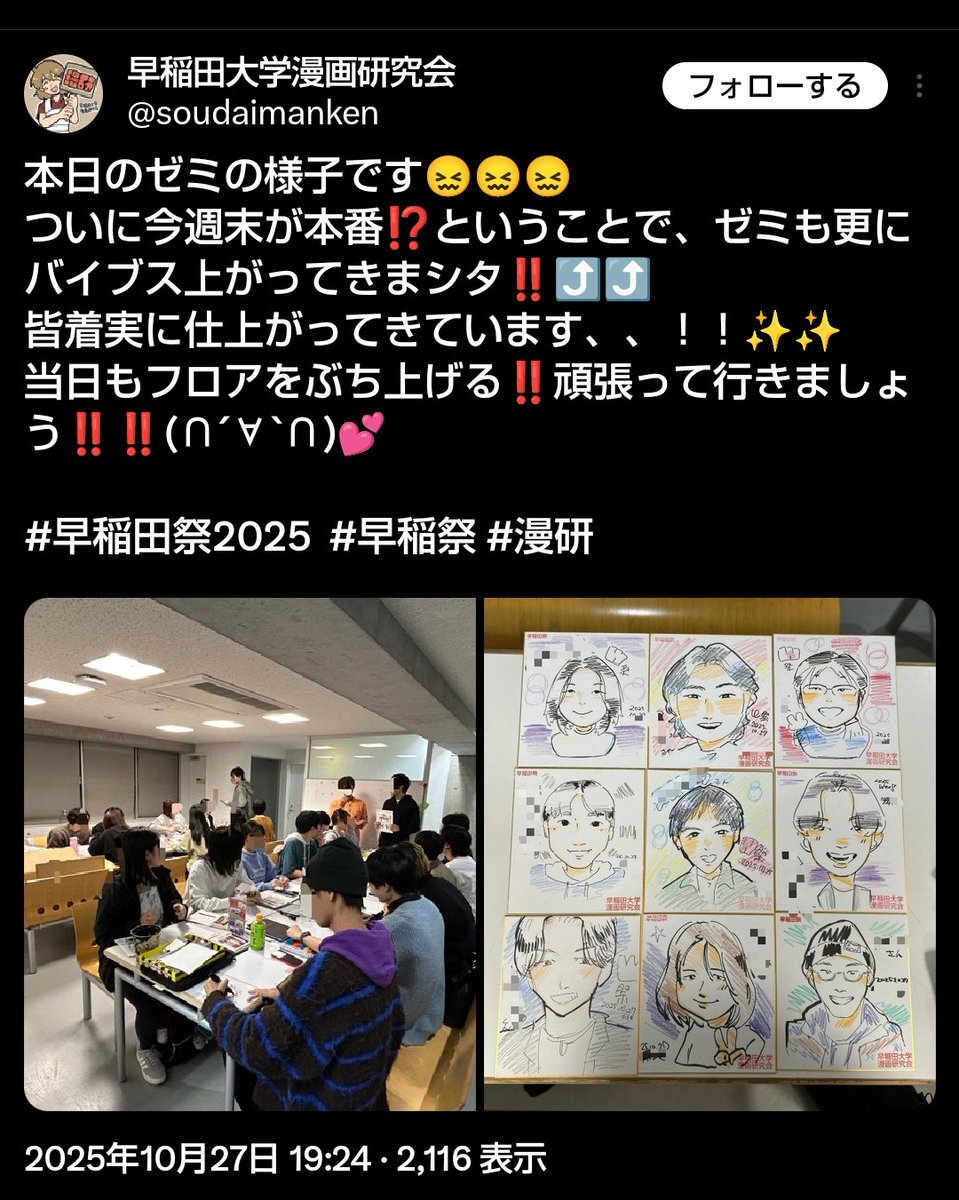 永年部費無料の早大漫画研究会、150人の活動費用は早稲田祭の似顔絵描きまくり&物販で稼ぐため呼び込み人捌き等が洗練され本気コスプレも目の保養🥰 画像元 x.com/soudaimanken/s… waseda.jp/inst/weekly/ci… 元呟き後半 >似顔絵、最大手なのに人捌きがプロで感動。あとコスプレイヤーさん多かった。 pic.x.com/tNmiG7MZcJ x.com/azuoooooooo/st…